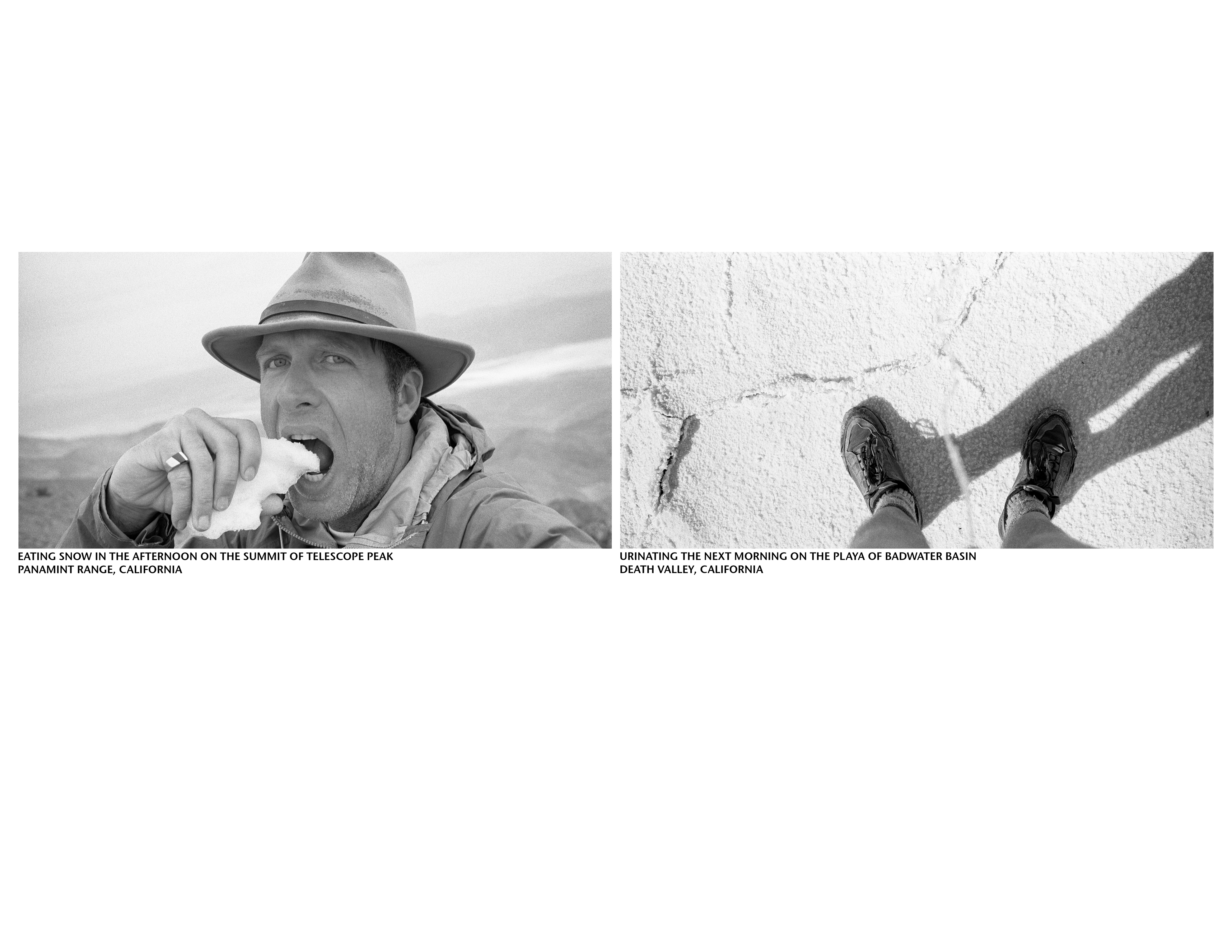 Late one afternoon, I ate snow on the summit of Telescope Peak. I urinated on Badwater Playa the next morning. With this action, I investigated the relationship between my body and the land. I also caused this precipitation to reach its eventual destination through an alternative process.